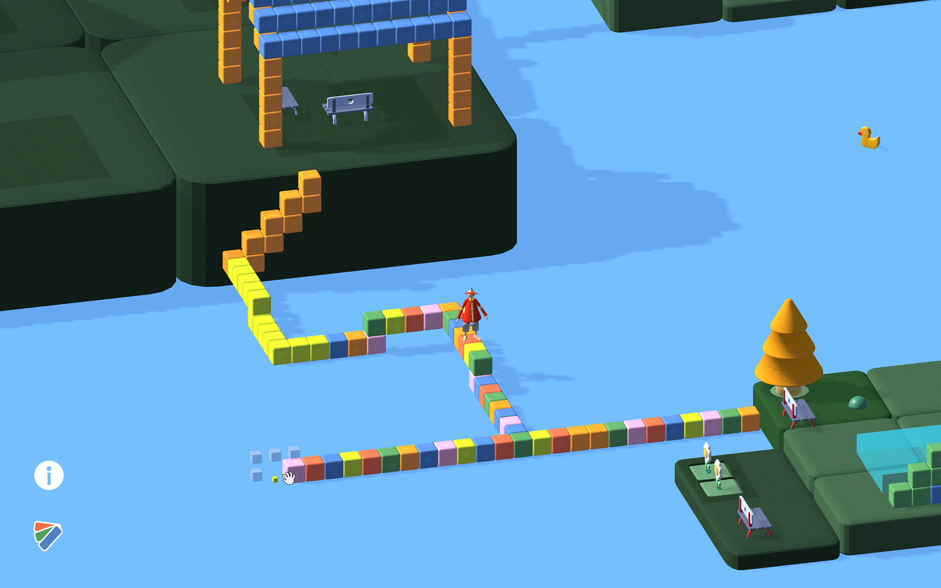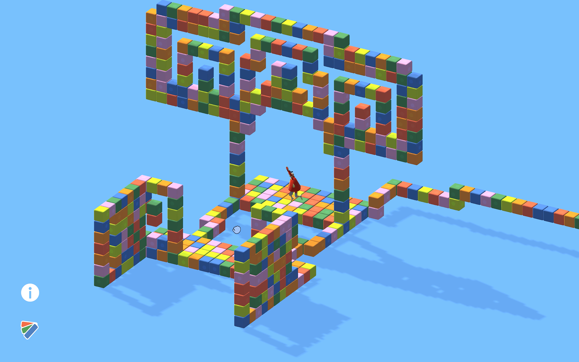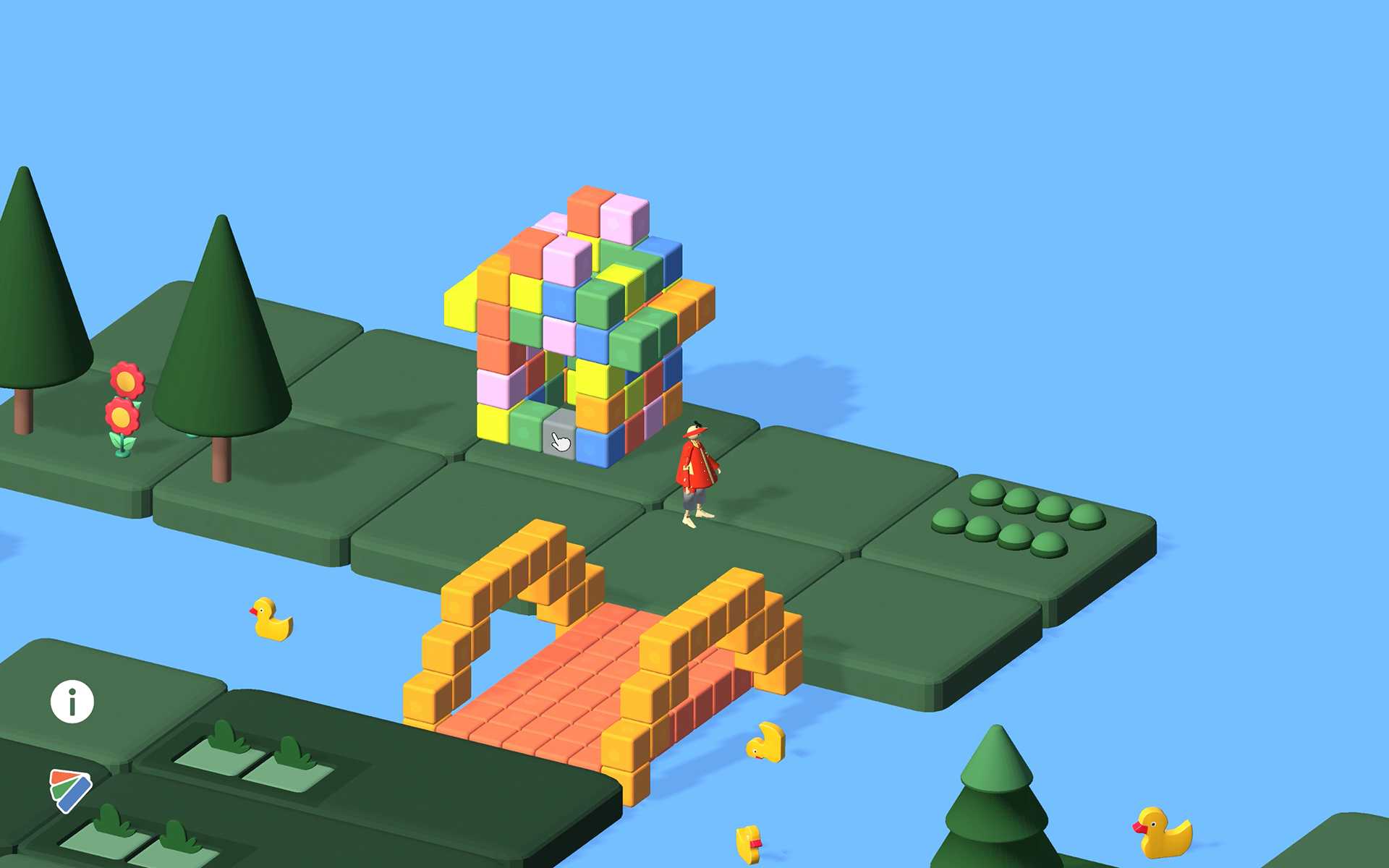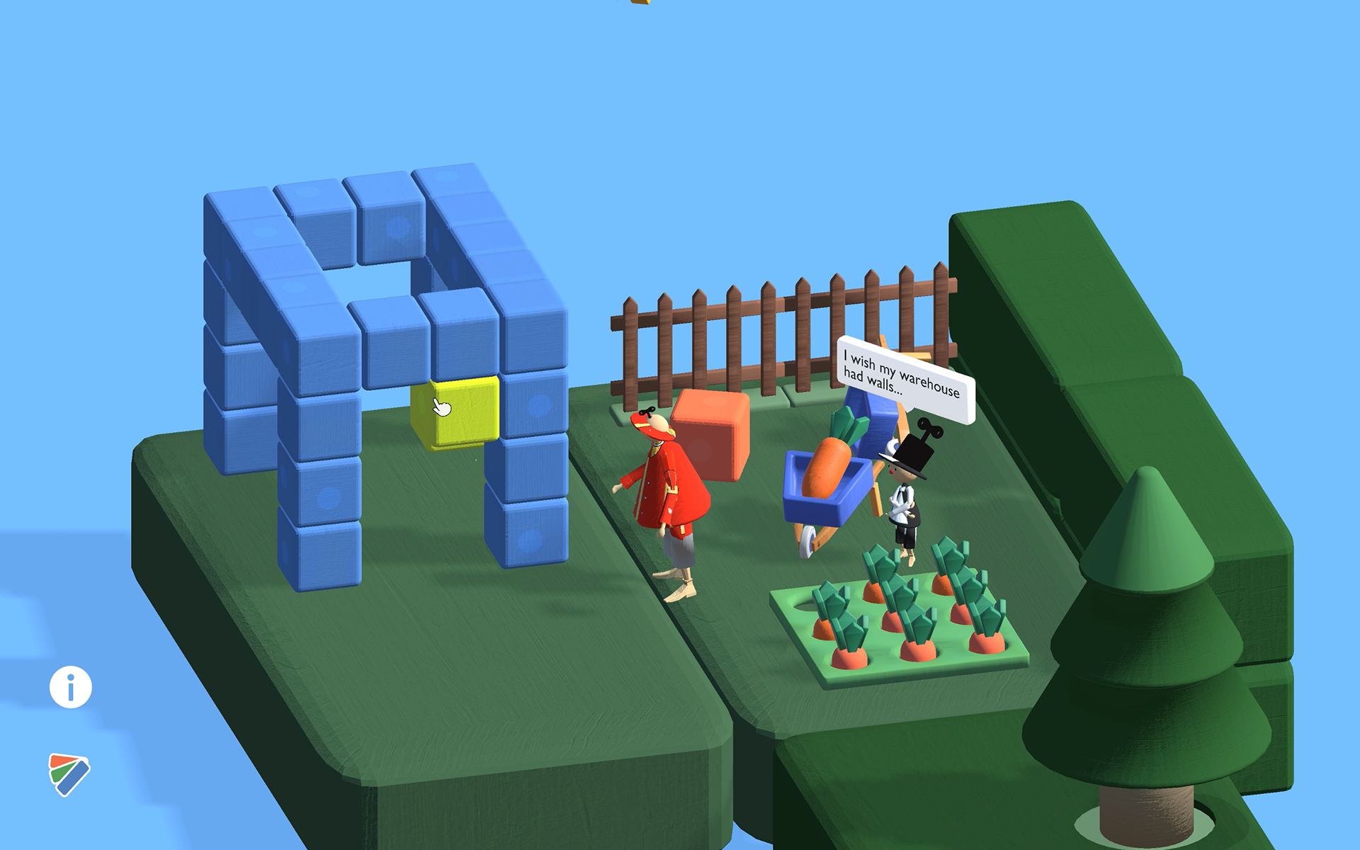 The player enters a world built from wooden, hand-crafted toy–like objects and leads the main character through different tasks by building structures from wooden cubes.